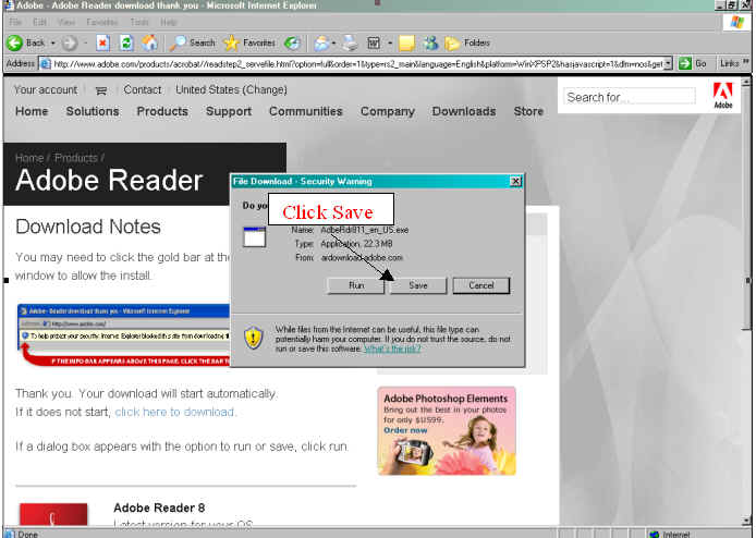 Select the location to save the Adobe Reader Exe.